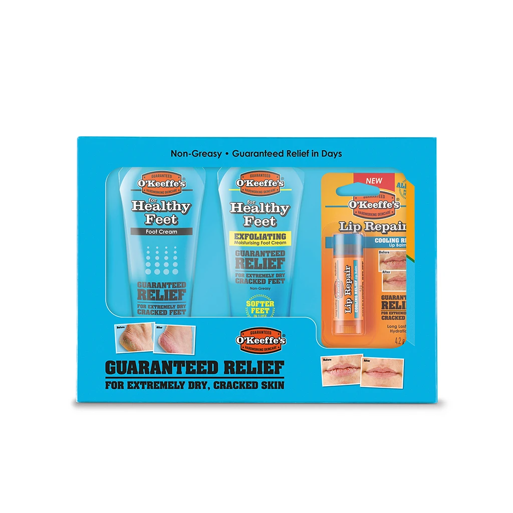 Gift set contains O’Keeffe’s Healthy Feet exfoliating foot cream 85ml tube, O’Keeffe’s Healthy Feet 85ml tube and O’Keeffe’s Lip Repair Cooling Relief 4.2g.